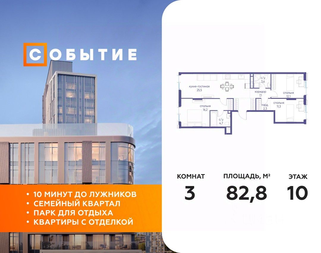 В продаже 3-к квартира от застройщика. Общая площадь 82.80, жилая 41.90, кухня 25.5. Квартира расположена на 10 этаже жилого квартала "Событие-6", корпус 2, Секция 4. Квартира без отделки. Срок сдачи: 4 кв. 2029 года.