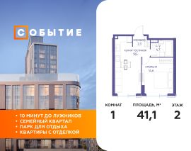 В продаже 1-к квартира от застройщика. Общая площадь 41.10, жилая 14.60, кухня 19.5. Квартира расположена на 2 этаже жилого квартала "Событие-6", корпус 2, Секция 5. Квартира без отделки. Срок сдачи: 4 кв. 2029 года.