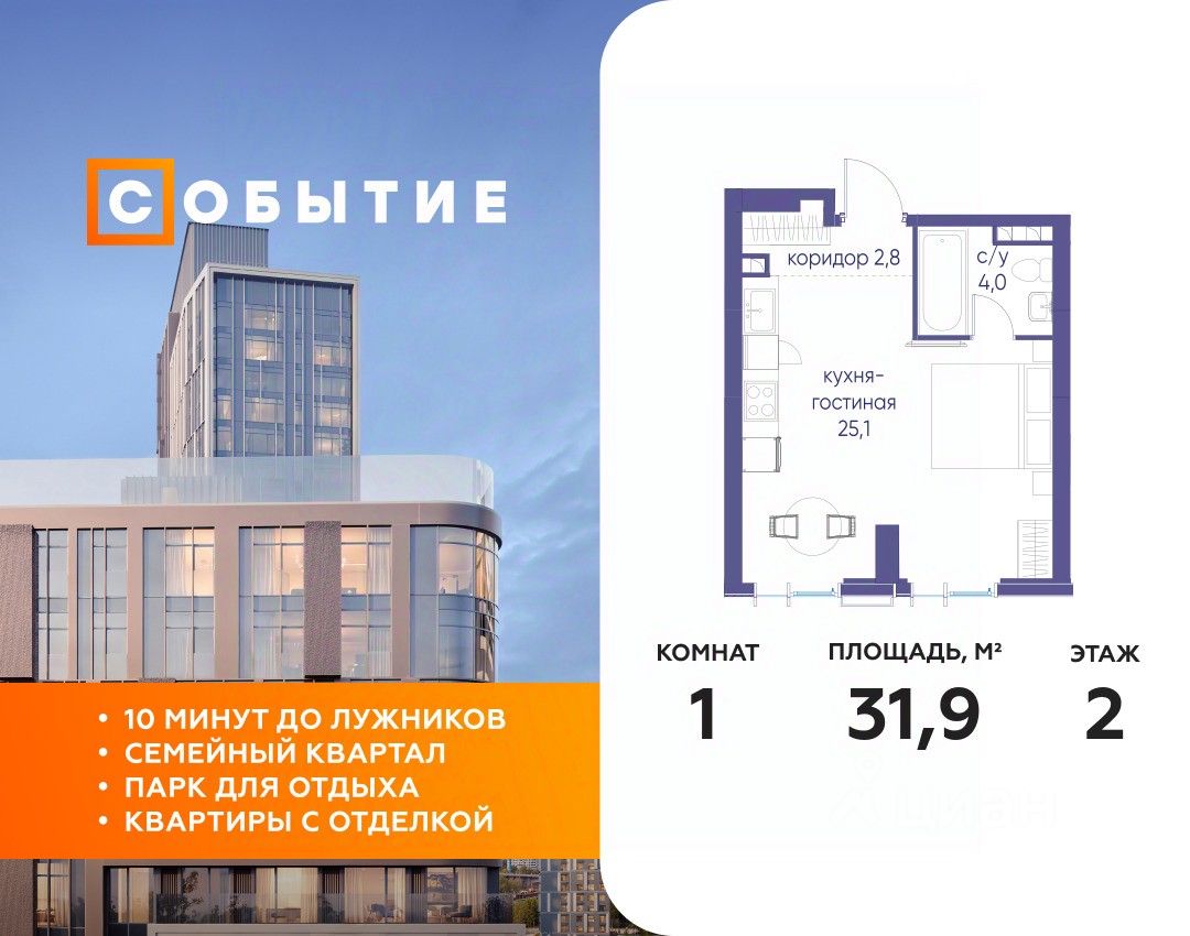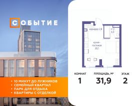 В продаже студия от застройщика. Общая площадь 31.90, жилая 17.20, кухня 7.9. Квартира расположена на 2 этаже жилого квартала "Событие-6", корпус 2, Секция 5. Квартира без отделки. Срок сдачи: 4 кв. 2029 года.