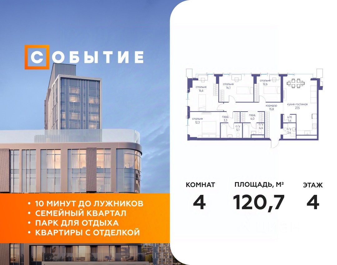 В продаже 1-к квартира от застройщика. Общая площадь 120.70, жилая 58.90, кухня 28.1. Квартира расположена на 4 этаже жилого квартала "Событие-6", корпус 2, Секция 5. Квартира без отделки. Срок сдачи: 4 кв. 2029 года.