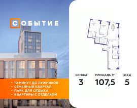 В продаже 2-к квартира от застройщика. Общая площадь 107.50, жилая 45.20, кухня 29.5. Квартира расположена на 5 этаже жилого квартала "Событие-6", корпус 2, Секция 5. Квартира без отделки. Срок сдачи: 4 кв. 2029 года.