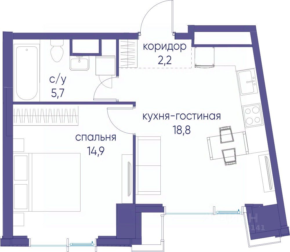 В продаже 1-к квартира от застройщика. Общая площадь 41.60, жилая 14.90, кухня 18.5. Квартира расположена на 7 этаже жилого квартала "Событие-6", корпус 2, Секция 5. Квартира без отделки. Срок сдачи: 4 кв. 2029 года.