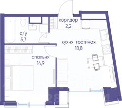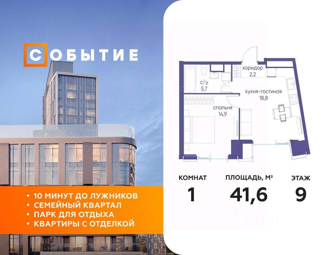 В продаже 1-к квартира от застройщика. Общая площадь 41.60, жилая 14.90, кухня 18.5. Квартира расположена на 9 этаже жилого квартала "Событие-6", корпус 2, Секция 5. Квартира без отделки. Срок сдачи: 4 кв. 2029 года.