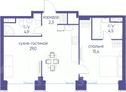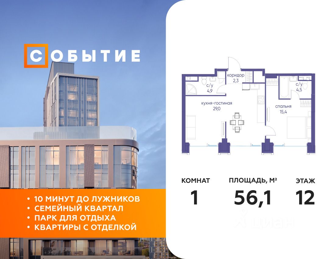 В продаже 1-к квартира от застройщика. Общая площадь 56.10, жилая 15.40, кухня 28.8. Квартира расположена на 12 этаже жилого квартала "Событие-6", корпус 2, Секция 5. Квартира без отделки. Срок сдачи: 4 кв. 2029 года.