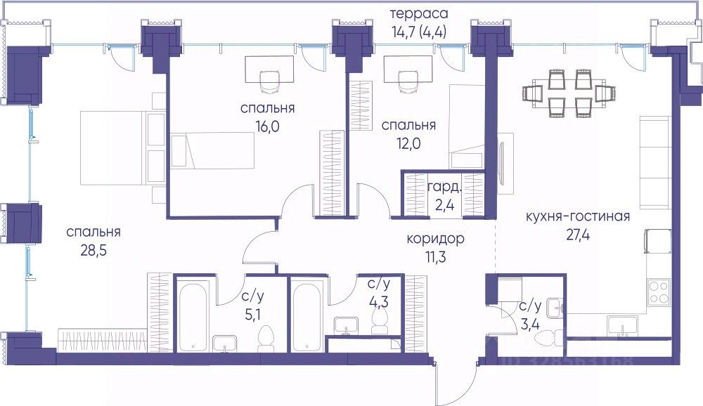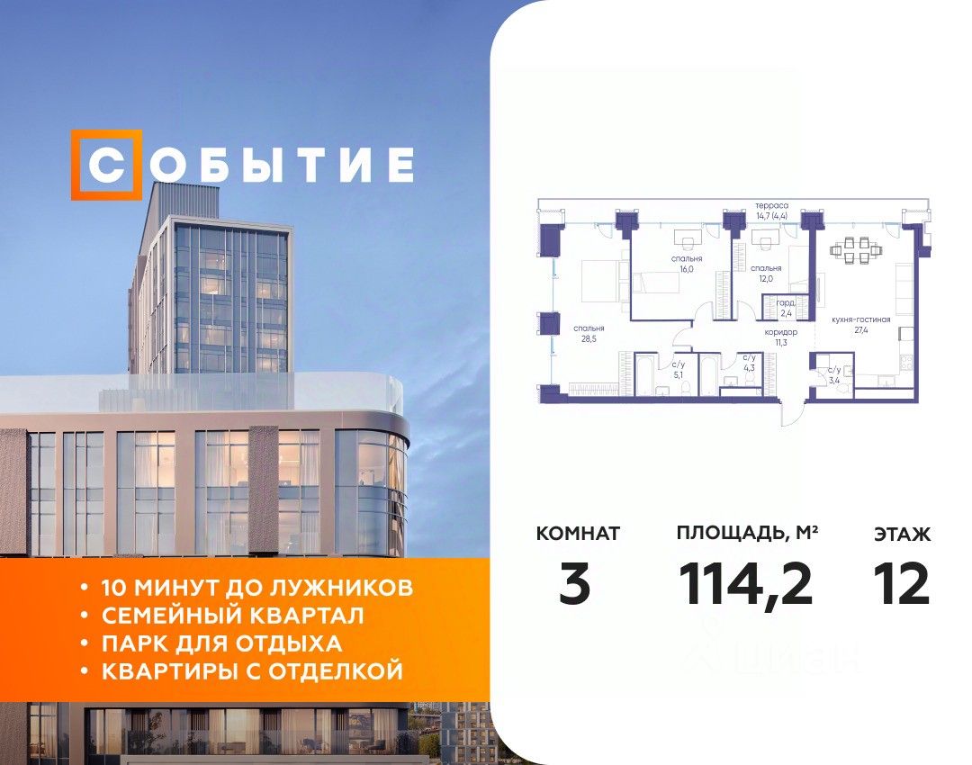В продаже 1-к квартира от застройщика. Общая площадь 114.20, жилая 58.90, кухня 26.7. Квартира расположена на 12 этаже жилого квартала "Событие-6", корпус 2, Секция 5. Квартира без отделки. Срок сдачи: 4 кв. 2029 года.