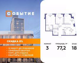 В продаже 1-к квартира от застройщика. Общая площадь 77.20, жилая 41.70, кухня 18. Квартира расположена на 18 этаже жилого квартала "Событие-6", корпус 2, Секция 5. Квартира без отделки. Срок сдачи: 4 кв. 2029 года.