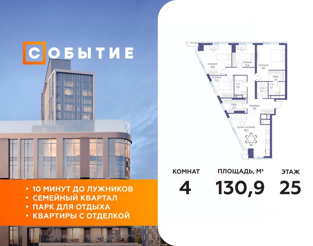 СОБЫТИЕ.6 — финальный дом парк-квартала СОБЫТИЕ на Мосфильмовской. Переезжайте в уже сформированный квартал с готовой инфраструктурой и парком! Премиальный жилой комплекс в престижном районе Москвы предлагает стильную архитектуру, продуманное благоустройство и великолепно разнообразие общественных пространств. Свой парк прямо возле дома!