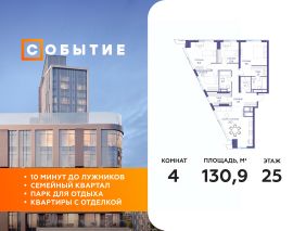В продаже 2-к квартира от застройщика. Общая площадь 130.90, жилая 63.80, кухня 26.7. Квартира расположена на 25 этаже жилого квартала "Событие-6", корпус 2, Секция 5. Квартира без отделки. Срок сдачи: 4 кв. 2029 года.