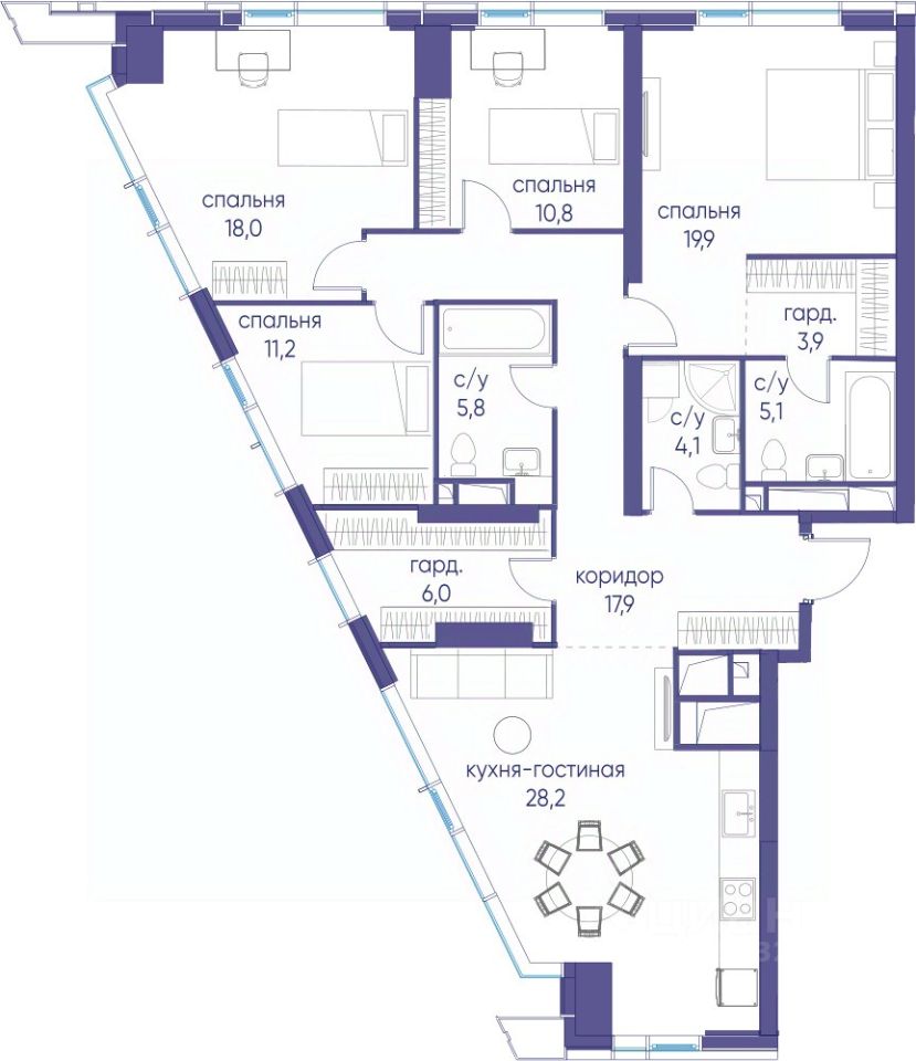 • Закрытые общественные пространства: детская комната, спортивный зал, коворкинг, лаунж-зоны.