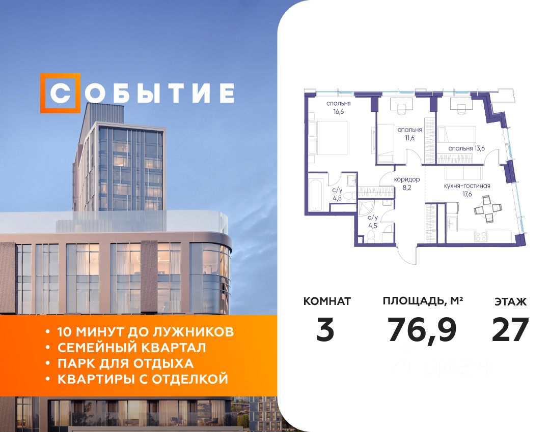 СОБЫТИЕ.6 — финальный дом парк-квартала СОБЫТИЕ на Мосфильмовской. Переезжайте в уже сформированный квартал с готовой инфраструктурой и парком! Премиальный жилой комплекс в престижном районе Москвы предлагает стильную архитектуру, продуманное благоустройство и великолепно разнообразие общественных пространств. Свой парк прямо возле дома!