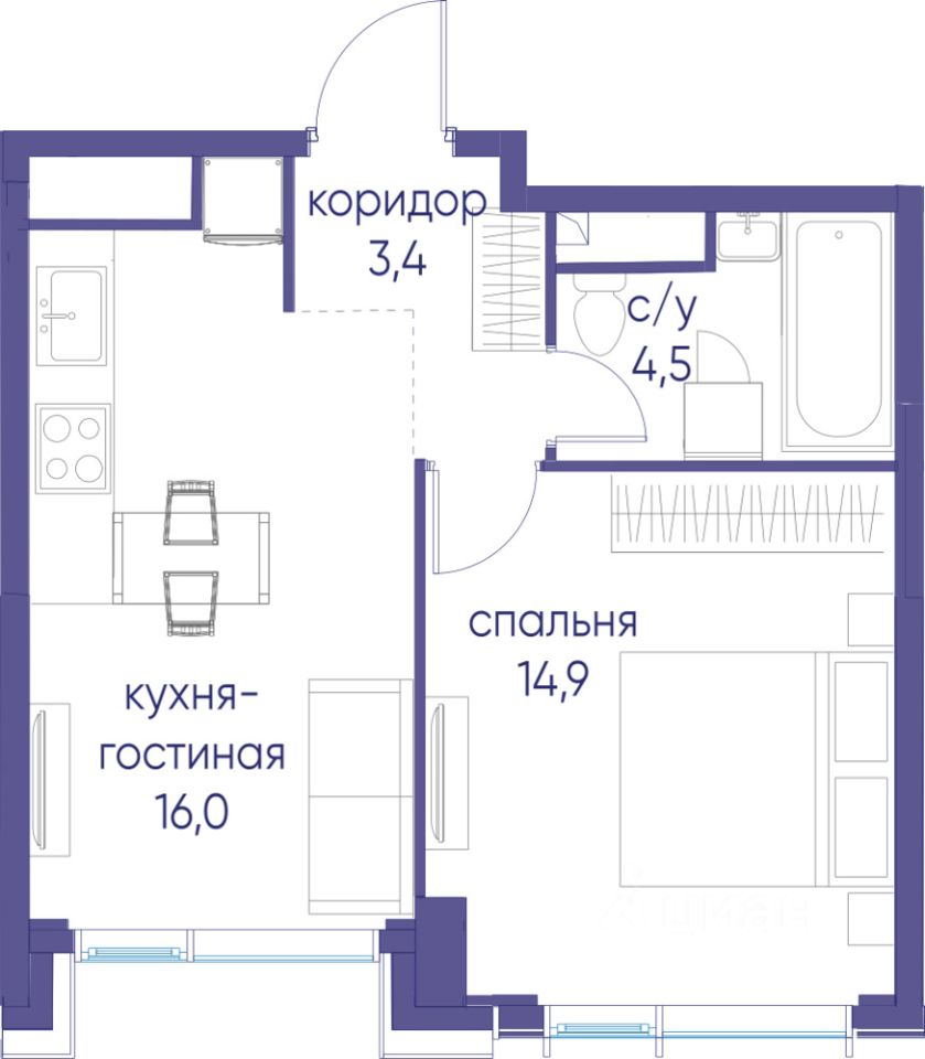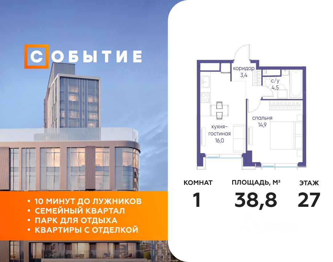 В продаже 1-к квартира от застройщика. Общая площадь 38.80, жилая 14.90, кухня 16. Квартира расположена на 27 этаже жилого квартала "Событие-6", корпус 2, Секция 5. Квартира без отделки. Срок сдачи: 4 кв. 2029 года.