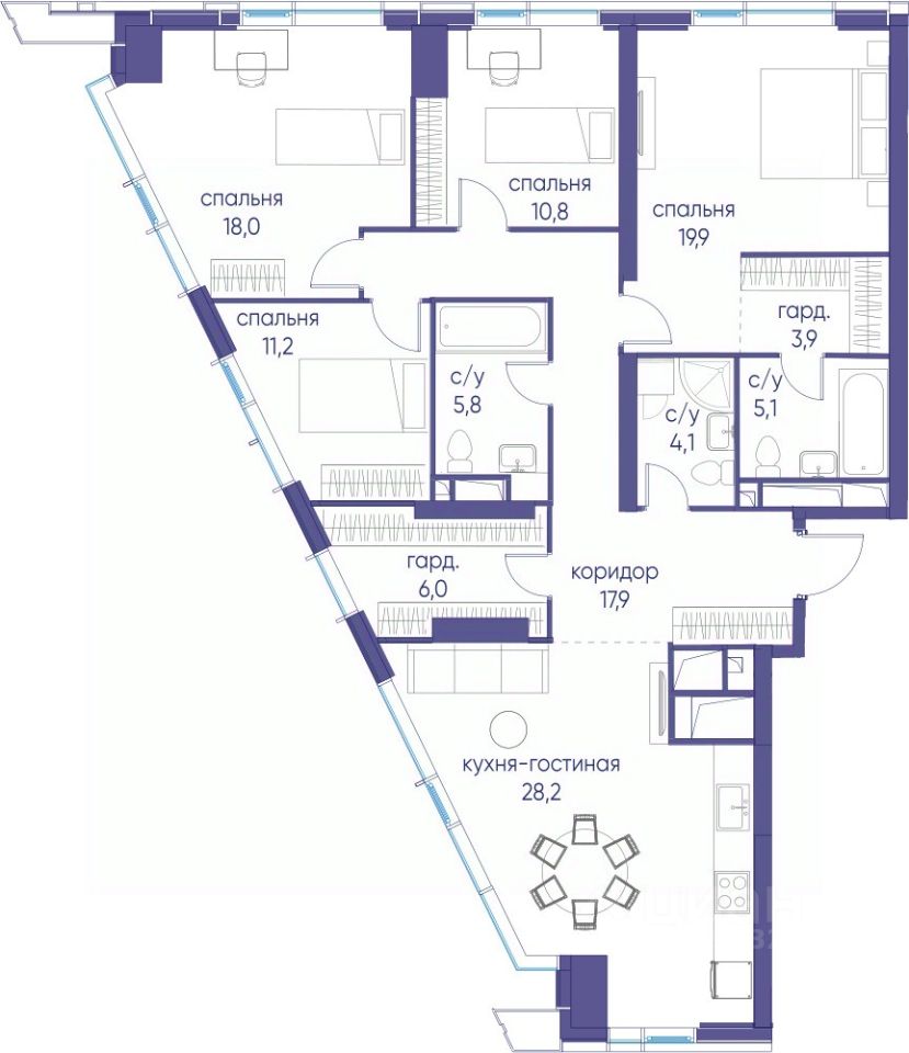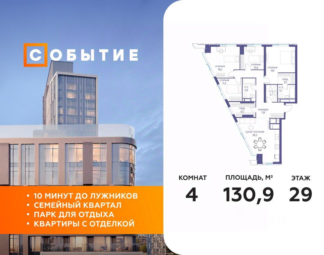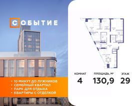 В продаже 2-к квартира от застройщика. Общая площадь 130.90, жилая 63.80, кухня 26.7. Квартира расположена на 29 этаже жилого квартала "Событие-6", корпус 2, Секция 5. Квартира без отделки. Срок сдачи: 4 кв. 2029 года.