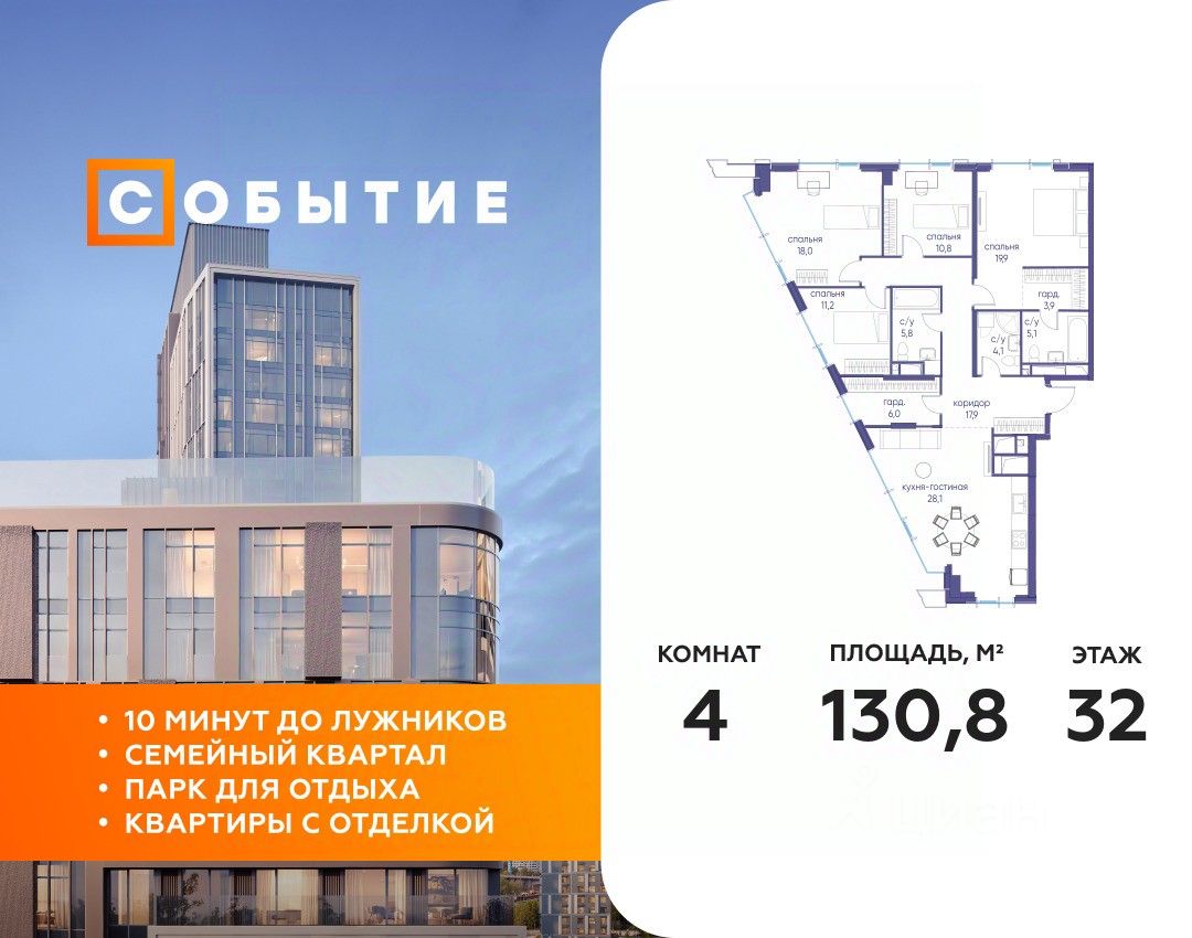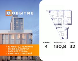 В продаже 2-к квартира от застройщика. Общая площадь 130.80, жилая 63.80, кухня 26.7. Квартира расположена на 32 этаже жилого квартала "Событие-6", корпус 2, Секция 5. Квартира без отделки. Срок сдачи: 4 кв. 2029 года.