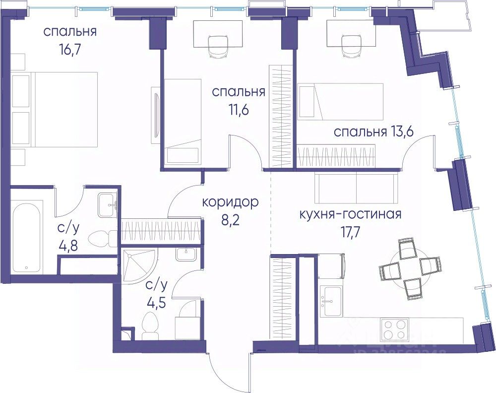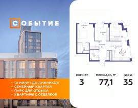 В продаже 1-к квартира от застройщика. Общая площадь 77.10, жилая 41.90, кухня 17.4. Квартира расположена на 35 этаже жилого квартала "Событие-6", корпус 2, Секция 5. Квартира без отделки. Срок сдачи: 4 кв. 2029 года.