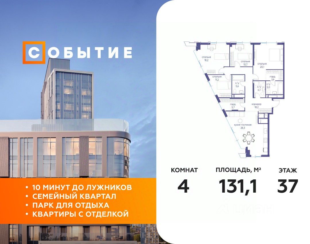 В продаже 2-к квартира от застройщика. Общая площадь 131.10, жилая 64.10, кухня 26.7. Квартира расположена на 37 этаже жилого квартала "Событие-6", корпус 2, Секция 5. Квартира без отделки. Срок сдачи: 4 кв. 2029 года.