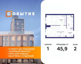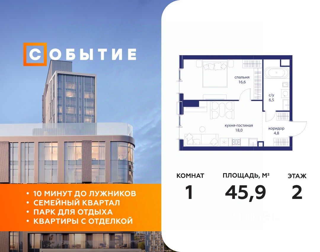 В продаже 1-к квартира от застройщика. Общая площадь 45.90, жилая 16.60, кухня 18. Квартира расположена на 2 этаже жилого квартала "Событие-6", корпус 1, Секция Секция 1. Квартира без отделки. Срок сдачи: 4 кв. 2029 года.