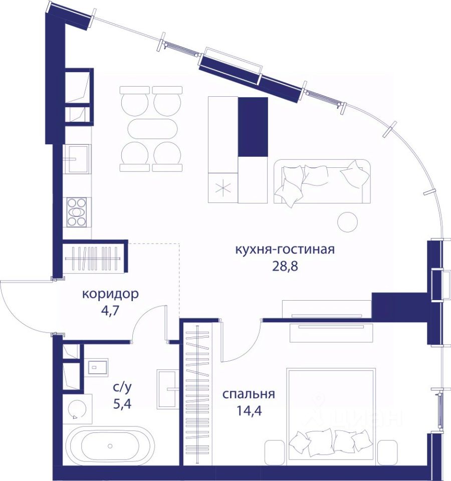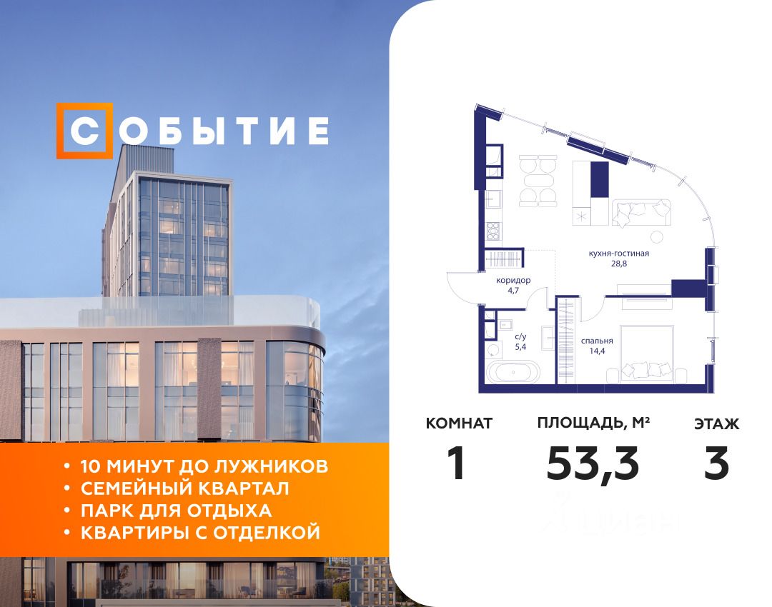 В продаже 1-к квартира от застройщика. Общая площадь 53.30, жилая 14.40, кухня 28.8. Квартира расположена на 3 этаже жилого квартала "Событие-6", корпус 1, Секция Секция 1. Квартира без отделки. Срок сдачи: 4 кв. 2029 года.