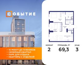 В продаже 1-к квартира от застройщика. Общая площадь 69.30, жилая 29.10, кухня 25.2. Квартира расположена на 3 этаже жилого квартала "Событие-6", корпус 1, Секция Секция 1. Квартира без отделки. Срок сдачи: 4 кв. 2029 года.