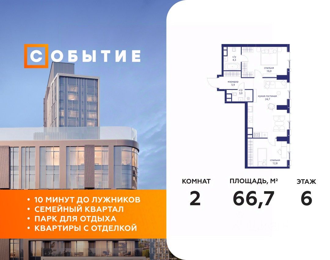 СОБЫТИЕ.6 — финальный дом парк-квартала СОБЫТИЕ на Мосфильмовской. Переезжайте в уже сформированный квартал с готовой инфраструктурой и парком! Премиальный жилой комплекс в престижном районе Москвы предлагает стильную архитектуру, продуманное благоустройство и великолепно разнообразие общественных пространств. Свой парк прямо возле дома!
