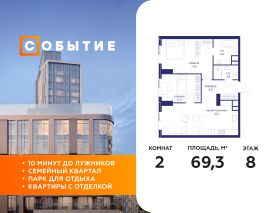В продаже 1-к квартира от застройщика. Общая площадь 69.30, жилая 29.10, кухня 25.2. Квартира расположена на 8 этаже жилого квартала "Событие-6", корпус 1, Секция Секция 1. Квартира без отделки. Срок сдачи: 4 кв. 2029 года.