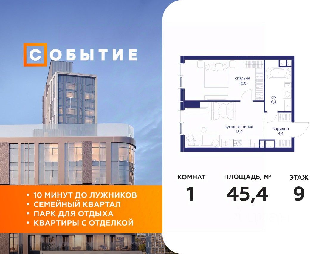 В продаже 1-к квартира от застройщика. Общая площадь 45.40, жилая 16.60, кухня 18. Квартира расположена на 9 этаже жилого квартала "Событие-6", корпус 1, Секция Секция 1. Квартира без отделки. Срок сдачи: 4 кв. 2029 года.