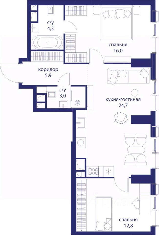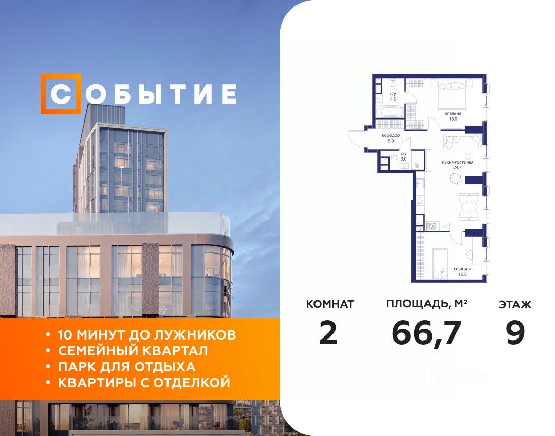 В продаже 2-к квартира от застройщика. Общая площадь 66.70, жилая 28.80, кухня 24.7. Квартира расположена на 9 этаже жилого квартала "Событие-6", корпус 1, Секция Секция 1. Квартира без отделки. Срок сдачи: 4 кв. 2029 года.