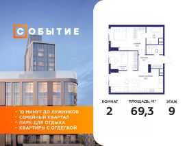 В продаже 1-к квартира от застройщика. Общая площадь 69.30, жилая 29.10, кухня 25.2. Квартира расположена на 9 этаже жилого квартала "Событие-6", корпус 1, Секция Секция 1. Квартира без отделки. Срок сдачи: 4 кв. 2029 года.