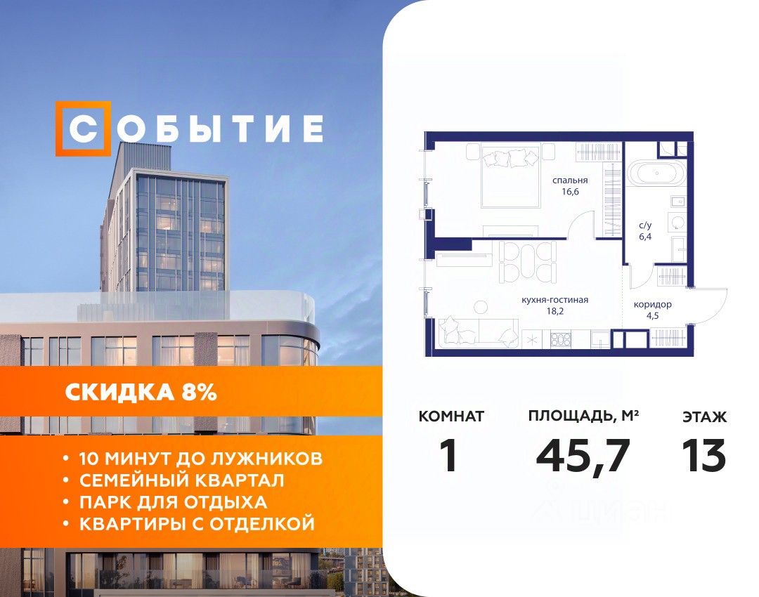 В продаже 1-к квартира от застройщика. Общая площадь 45.70, жилая 16.60, кухня 18.2. Квартира расположена на 13 этаже жилого квартала "Событие-6", корпус 1, Секция Секция 1. Квартира без отделки. Срок сдачи: 4 кв. 2029 года.