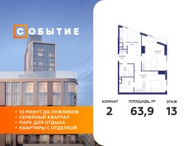 В продаже 1-к квартира от застройщика. Общая площадь 63.90, жилая 34.60, кухня 16.2. Квартира расположена на 13 этаже жилого квартала "Событие-6", корпус 1, Секция Секция 1. Квартира без отделки. Срок сдачи: 4 кв. 2029 года.