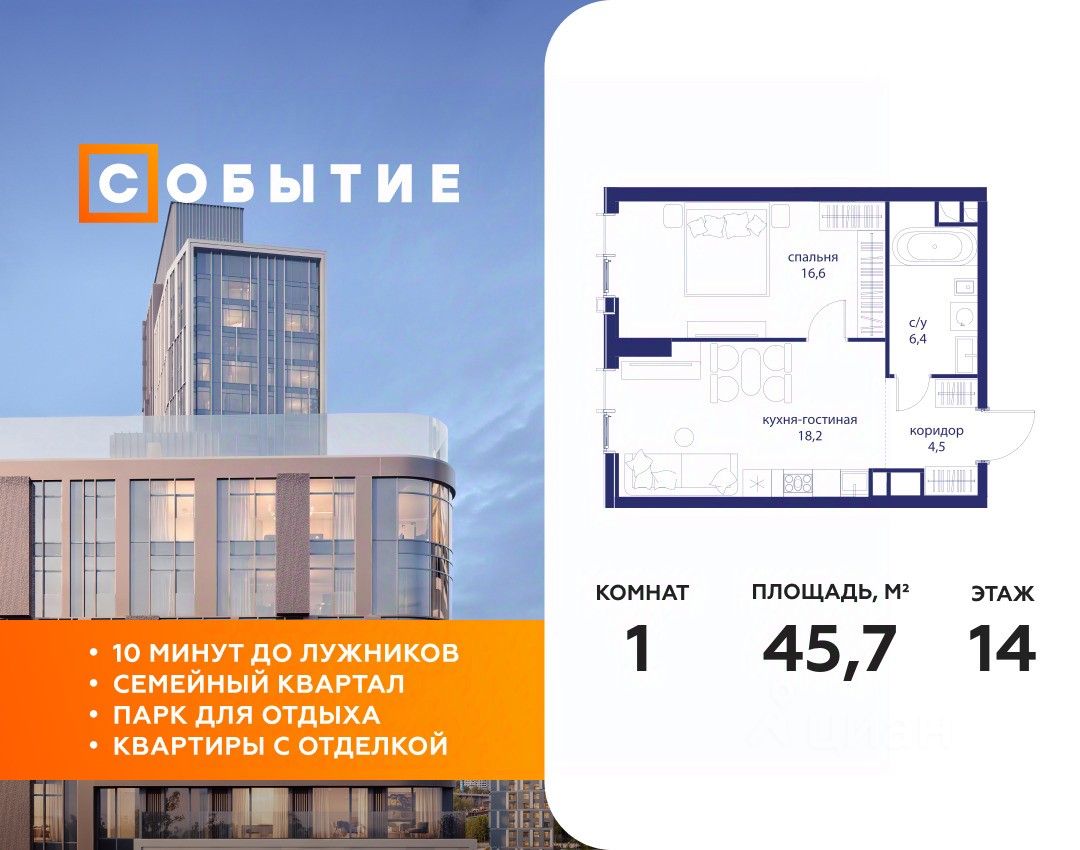 В продаже 1-к квартира от застройщика. Общая площадь 45.70, жилая 16.60, кухня 18.2. Квартира расположена на 14 этаже жилого квартала "Событие-6", корпус 1, Секция Секция 1. Квартира без отделки. Срок сдачи: 4 кв. 2029 года.