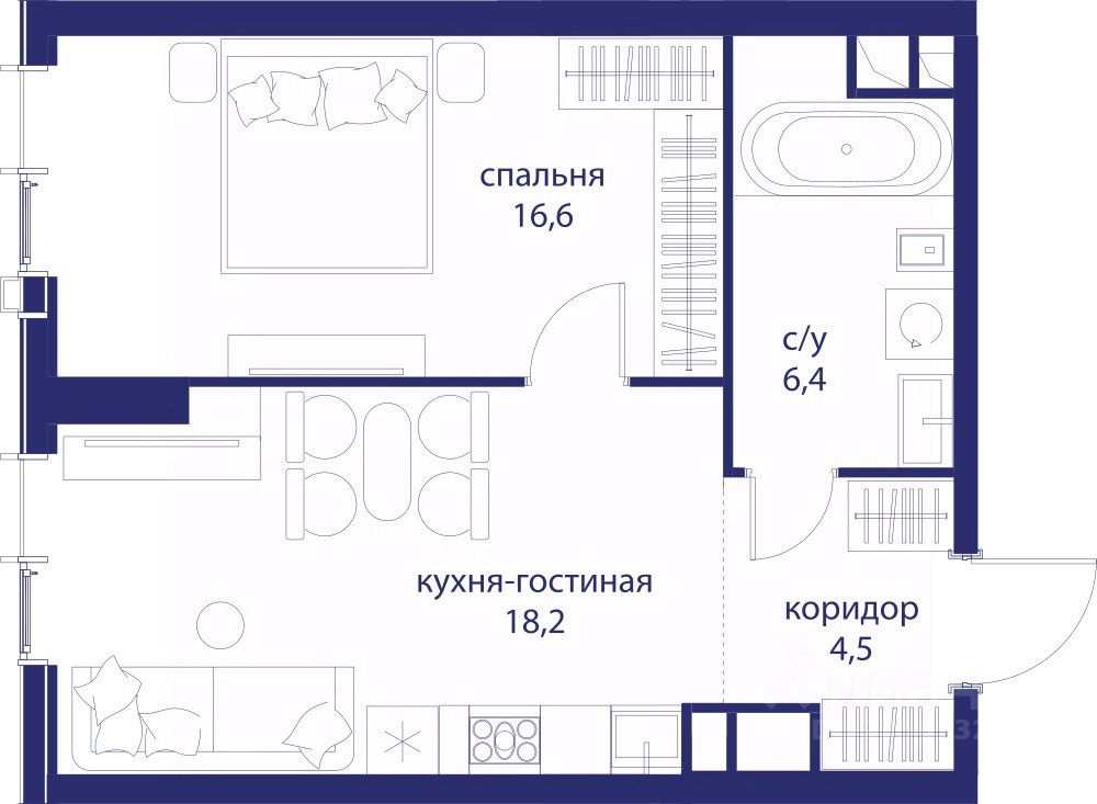 • Закрытые общественные пространства: детская комната, спортивный зал, коворкинг, лаунж-зоны.