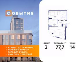 В продаже 1-к квартира от застройщика. Общая площадь 77.70, жилая 30.30, кухня 30.6. Квартира расположена на 14 этаже жилого квартала "Событие-6", корпус 1, Секция Секция 1. Квартира без отделки. Срок сдачи: 4 кв. 2029 года.