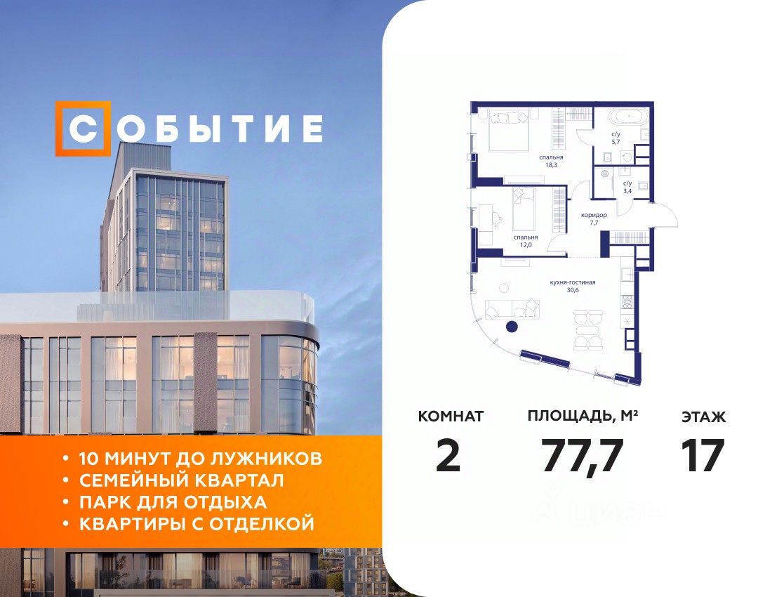 В продаже 1-к квартира от застройщика. Общая площадь 77.70, жилая 30.30, кухня 30.6. Квартира расположена на 17 этаже жилого квартала "Событие-6", корпус 1, Секция Секция 1. Квартира без отделки. Срок сдачи: 4 кв. 2029 года.
