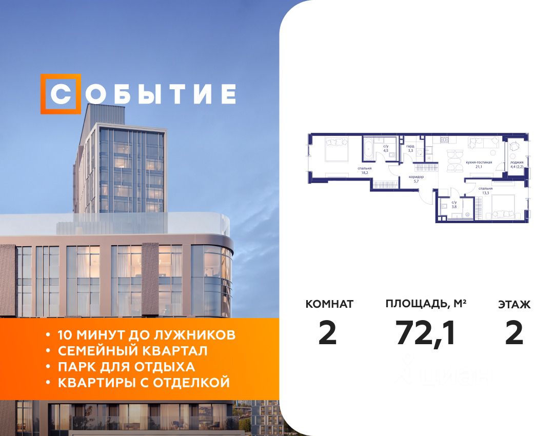 В продаже 2-к квартира от застройщика. Общая площадь 72.10, жилая 31.50, кухня 21.1. Квартира расположена на 2 этаже жилого квартала "Событие-6", корпус 1, Секция Секция 2. Квартира с чистовой отделкой. Срок сдачи: 4 кв. 2029 года.