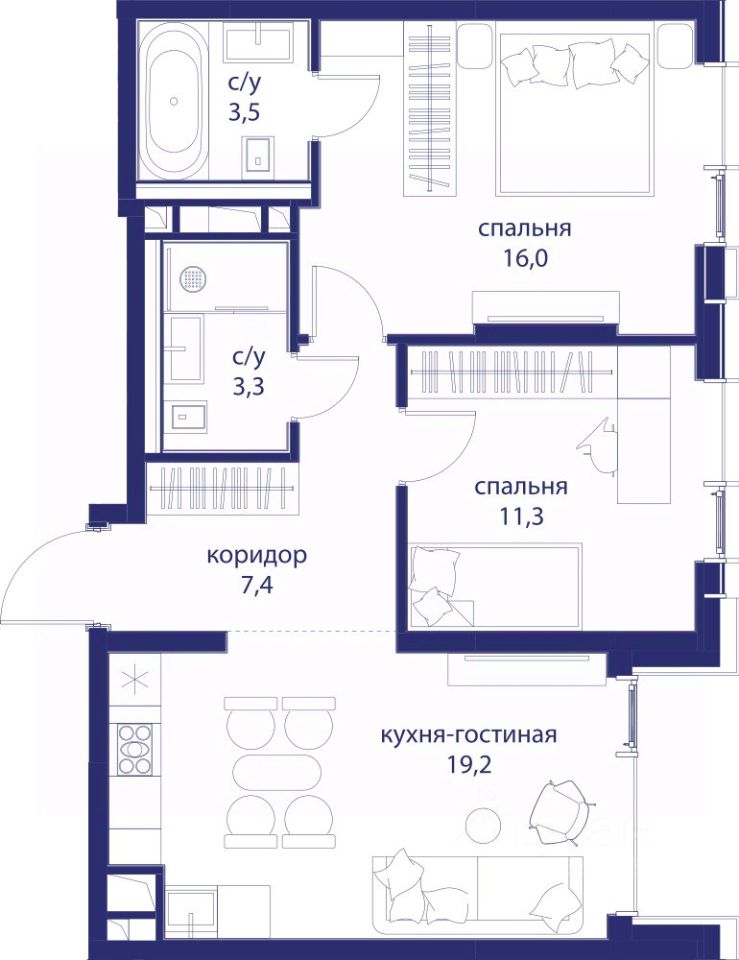 • Закрытые общественные пространства: детская комната, спортивный зал, коворкинг, лаунж-зоны.