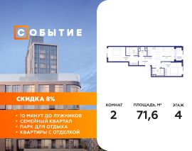 В продаже 2-к квартира от застройщика. Общая площадь 71.60, жилая 31.60, кухня 21.1. Квартира расположена на 4 этаже жилого квартала "Событие-6", корпус 1, Секция Секция 2. Квартира с чистовой отделкой. Срок сдачи: 4 кв. 2029 года.