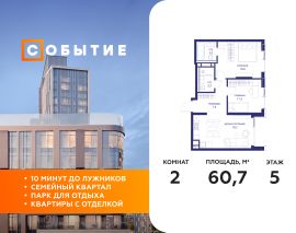 В продаже 2-к квартира от застройщика. Общая площадь 60.70, жилая 27.30, кухня 19.2. Квартира расположена на 5 этаже жилого квартала "Событие-6", корпус 1, Секция Секция 2. Квартира с чистовой отделкой. Срок сдачи: 4 кв. 2029 года.