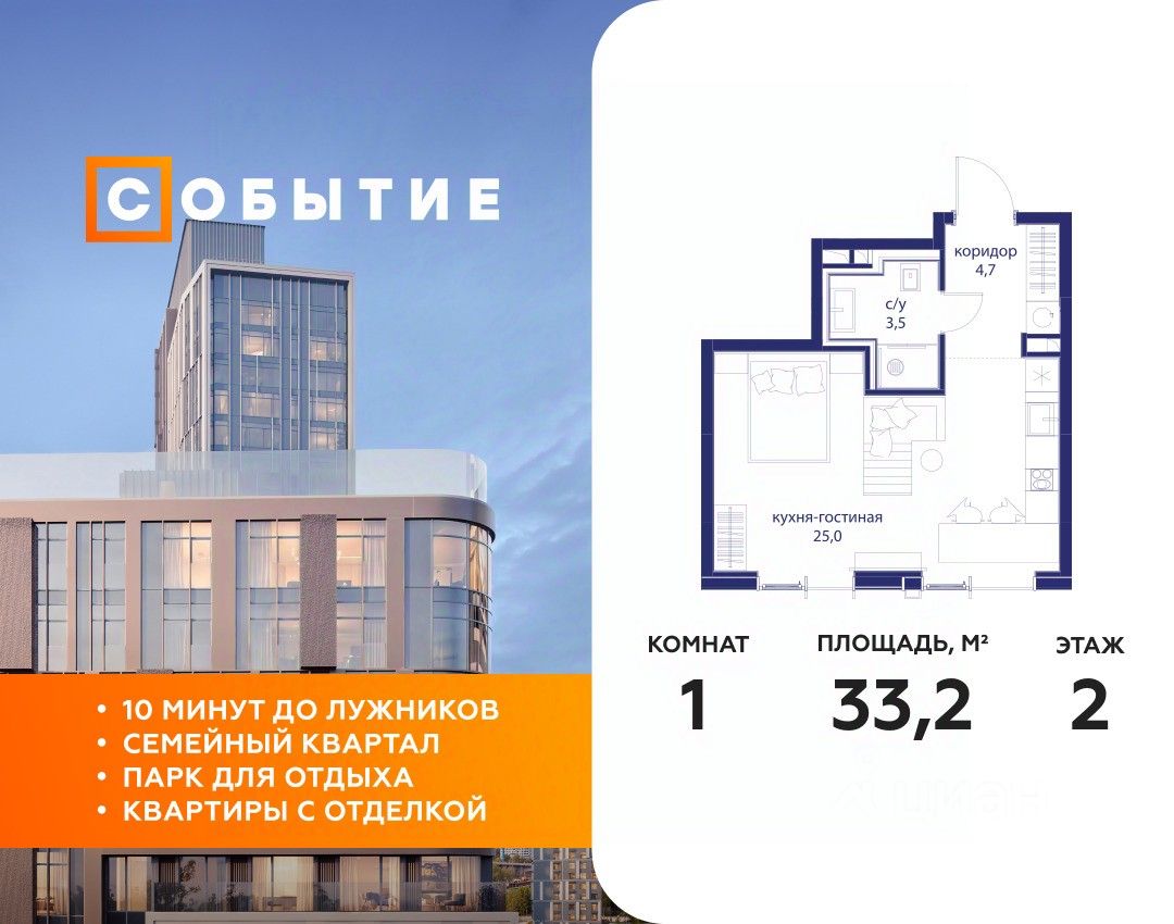 В продаже студия от застройщика. Общая площадь 33.20, жилая 16.40, кухня 8.6. Квартира расположена на 2 этаже жилого квартала "Событие-6", корпус 1, Секция Секция 3. Квартира с чистовой отделкой. Срок сдачи: 4 кв. 2029 года.