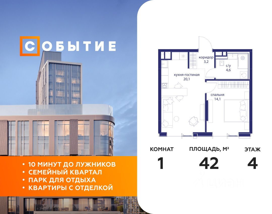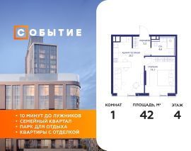 В продаже 1-к квартира от застройщика. Общая площадь 42.00, жилая 14.10, кухня 20.1. Квартира расположена на 4 этаже жилого квартала "Событие-6", корпус 1, Секция Секция 3. Квартира с чистовой отделкой. Срок сдачи: 4 кв. 2029 года.