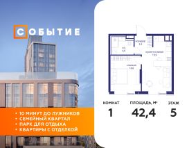 В продаже 1-к квартира от застройщика. Общая площадь 42.40, жилая 14.60, кухня 19.9. Квартира расположена на 5 этаже жилого квартала "Событие-6", корпус 1, Секция Секция 3. Квартира с чистовой отделкой. Срок сдачи: 4 кв. 2029 года.