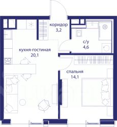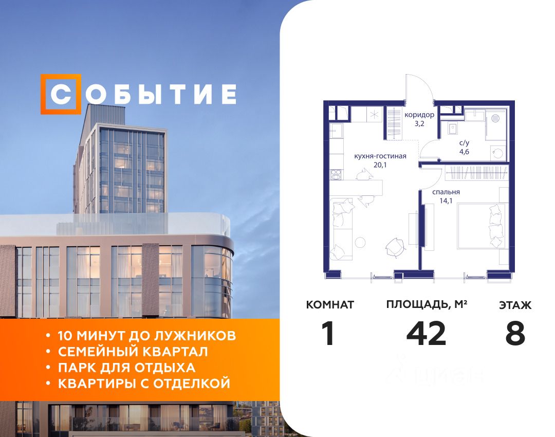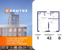 В продаже 1-к квартира от застройщика. Общая площадь 42.00, жилая 14.10, кухня 20.1. Квартира расположена на 8 этаже жилого квартала "Событие-6", корпус 1, Секция Секция 3. Квартира с чистовой отделкой. Срок сдачи: 4 кв. 2029 года.