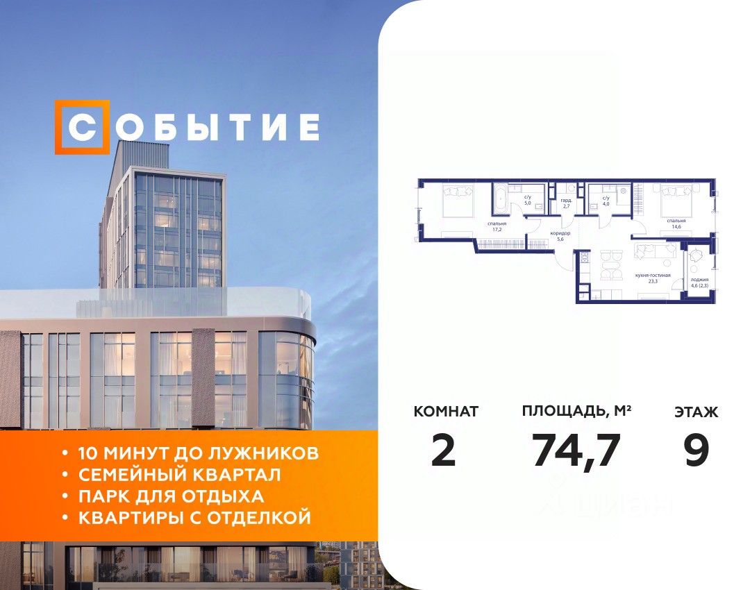 В продаже 2-к квартира от застройщика. Общая площадь 74.70, жилая 31.80, кухня 23.3. Квартира расположена на 9 этаже жилого квартала "Событие-6", корпус 1, Секция Секция 3. Квартира с чистовой отделкой. Срок сдачи: 4 кв. 2029 года.