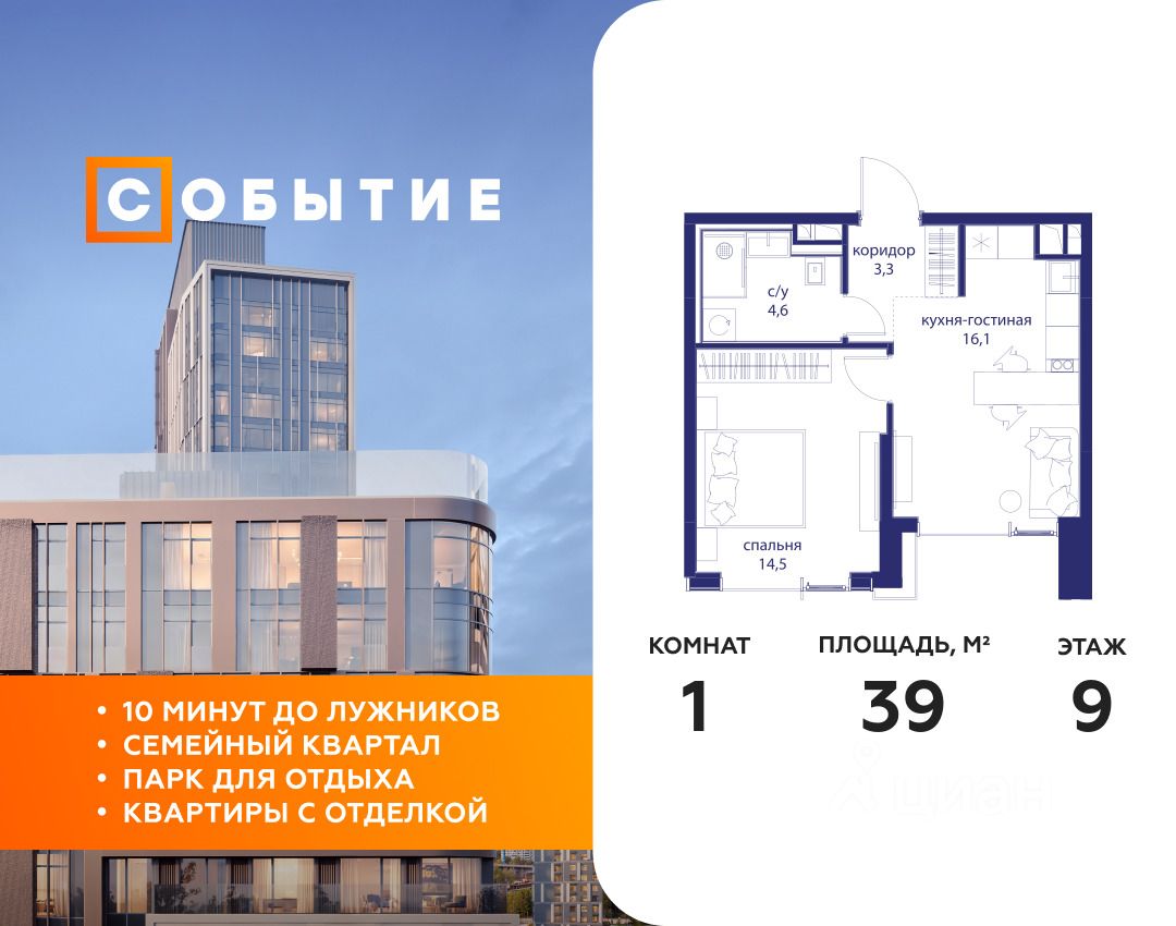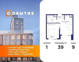 В продаже 1-к квартира от застройщика. Общая площадь 39.00, жилая 14.50, кухня 16.6. Квартира расположена на 9 этаже жилого квартала "Событие-6", корпус 1, Секция Секция 3. Квартира с чистовой отделкой. Срок сдачи: 4 кв. 2029 года.