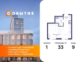 В продаже студия от застройщика. Общая площадь 33.00, жилая 16.50, кухня 8.5. Квартира расположена на 9 этаже жилого квартала "Событие-6", корпус 1, Секция Секция 3. Квартира с чистовой отделкой. Срок сдачи: 4 кв. 2029 года.