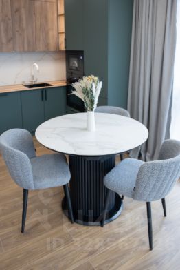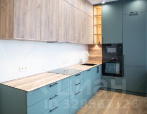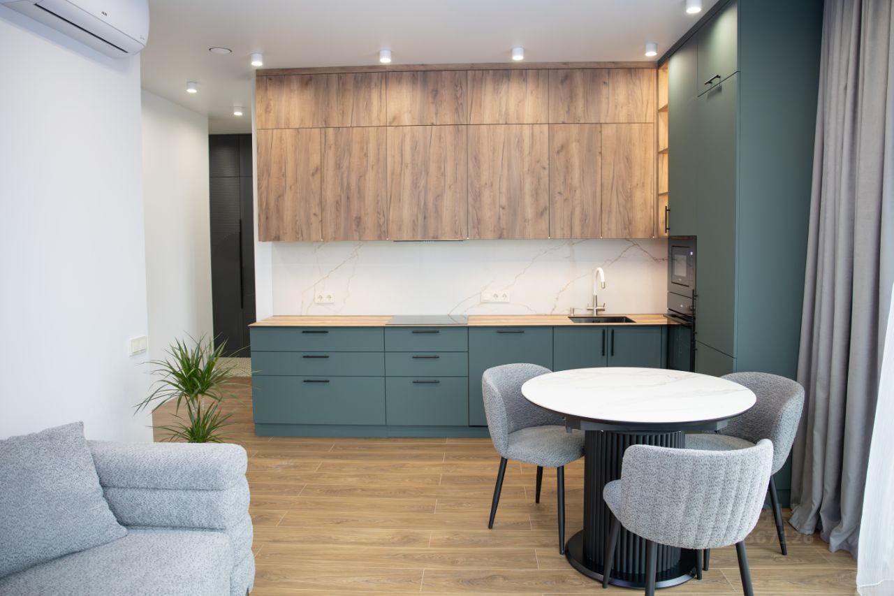 Просторная кухня-гостиная 23м2 с обеденной зоной и диваном-кроватью современная кухня, столешница HPL Compact 12мм. Со всей встроенной техникой: холодильник, варочная панель, духовой шкаф, вытяжка, микроволновка, посудомоечная машина.