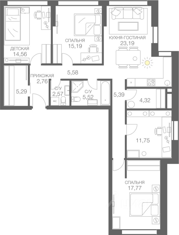 Предлагается Вашему вниманию 3х-комнатная квартира бизнес-класса, на 12-м этаже, без отделки, в Жилом комплексе HEADLINER".