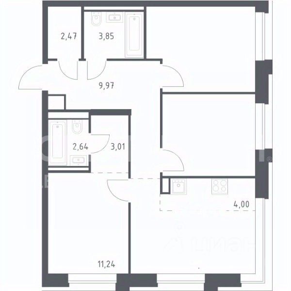 Общая площадь 74 кв.м, кухня-гостиная, 3 комнаты, мастер спальня, два санузла.