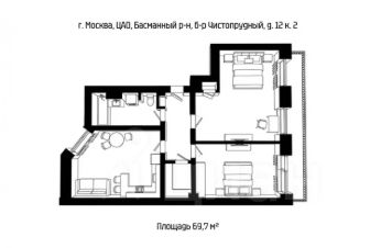 Квартира общей площадью 69.7 м² с функциональной планировкой: В квартире большая кухня-гостиная площадью 18.6 м². В данном доме такие просторные кухни большая редкость. Кухня полностью укомплектована техникой. Есть просторная гардеробная. Обе спальни с видом на Чистые пруды. Есть уютный балкон вдоль. Потолки 2,9 м. На полу в спальнях паркет, на кухне паркетная доска. Качественные окна,