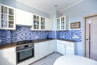 Кухню с тёплым полом, плиточным покрытием и продуманной системой хранения. Кухня укомплектована мебелью ИКЕА с подсветкой, предусмотрено много мест хранения, в том числе функциональные шкафы под окном. Техника: духовой шкаф ИКЕА, микроволновая печь LG, встроенная посудомоечная машина Bosch 6060, холодильник Electrolux, фильтр очистки воды Аквафор.