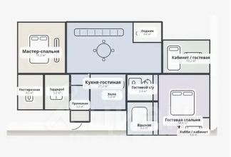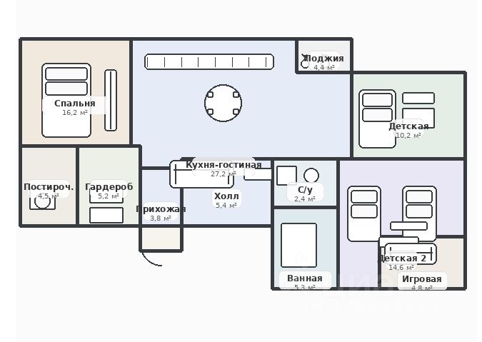 общей площадью 32,79 м², 3 спальни (16,18 / 14,58 / 10,20 м²), 2 санузла, лоджию 4,4 м² и блок подсобных